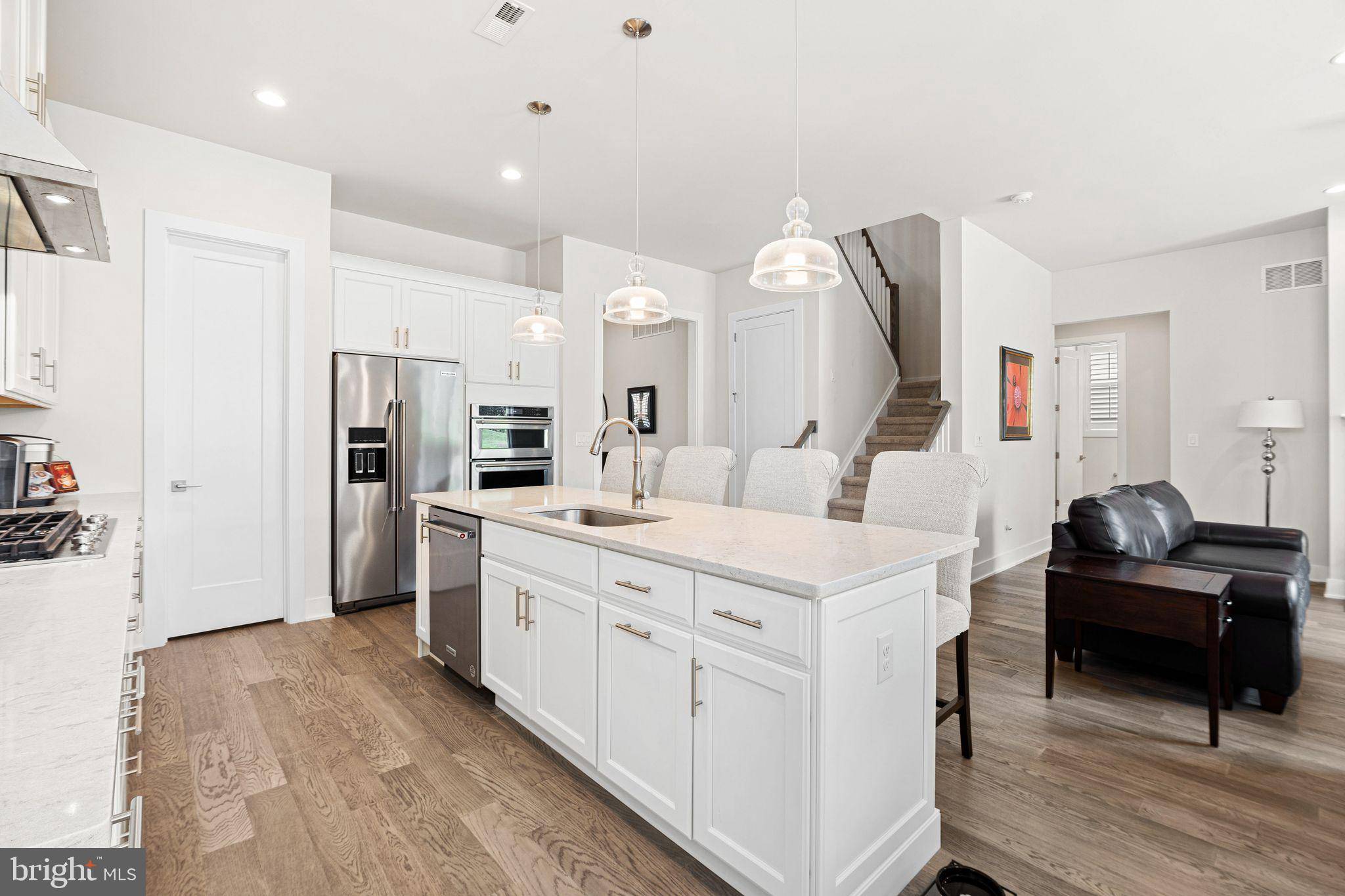 Step inside to find an open and airy floor plan with engineered hardwood flooring and soaring ceilings throughout the main level. The welcoming foyer sets the tone, with a formal dining room to the right—ideal for gatherings and holidays. At the heart of the home is the gourmet eat-in kitchen, featuring soft-close cabinetry, a large quartz center island, high-end stainless steel appliances, and a sunlit breakfast area. The kitchen flows seamlessly into the spacious family room, where oversized windows flood the space with natural light, and a gas fireplace adds a cozy touch. Sliding doors lead to a beautifully finished two-tier outdoor space with a custom Trex deck, lower-level paver patio, fenced-in yard, and exterior lighting—perfect for entertaining or relaxing. Also on the main level is an office / flex space with French doors and a powder room, tucked away for function and flexibility. Rounding out this floor is a mudroom which leads to the oversized two car garage.